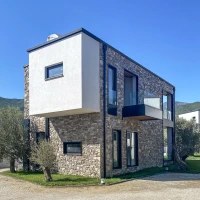 Bu projede duvar kaplaması olarak kültür taşı kullanımı yalnızca estetik bir tercih değil; aynı zamanda bölgenin mirasına bir saygı duruşudur. Tarihte Rum taş ustalarıyla ünlü olan bu bölge, pek çok tarihi taş binaya da ev sahipliği yapmaktadır. Bu villalarda kullanılan yığma uygulama, antik Yunan duvar işçiliği geleneklerine selam göndermektedir.